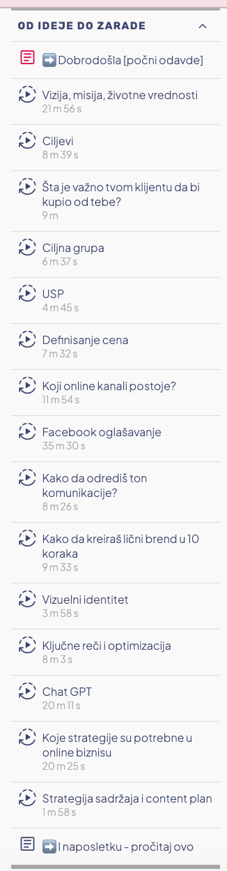 Kurs je samostalan, preuzmeš ga i gledaš lekcije sama. Ali ako ti zatreba dodatna pomoć nakon što je odradiš, možeš posetiti INFO stranicu na mom sajtu i saznati kako možemo da radimo. Link: https://www.vesnaristova.com/info